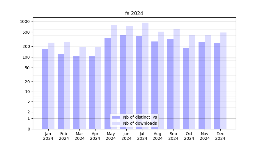 Number of downloads for workflow package fs, year by year, from 2025 back to 2015 (years with no downloads are omitted):