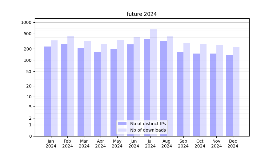 Number of downloads for workflow package future, year by year, from 2025 back to 2015 (years with no downloads are omitted):
