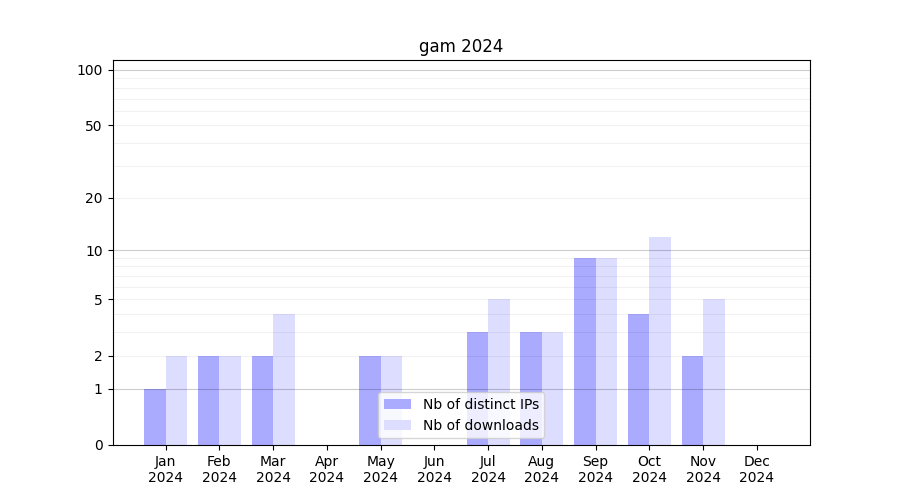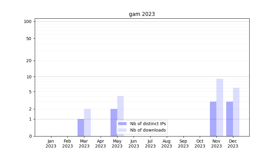 Number of downloads for workflow package gam, year by year, from 2025 back to 2015 (years with no downloads are omitted):