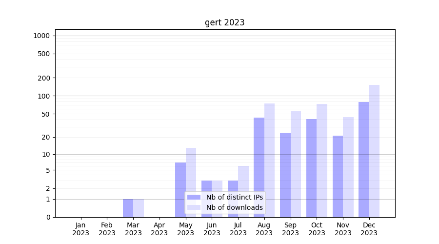 Number of downloads for workflow package gert, year by year, from 2025 back to 2015 (years with no downloads are omitted):