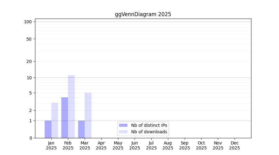 Number of downloads for workflow package ggVennDiagram, year by year, from 2025 back to 2015 (years with no downloads are omitted):