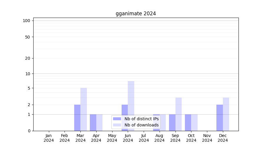 Number of downloads for workflow package gganimate, year by year, from 2025 back to 2015 (years with no downloads are omitted):
