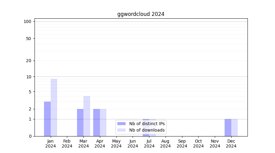 Number of downloads for workflow package ggwordcloud, year by year, from 2025 back to 2015 (years with no downloads are omitted):