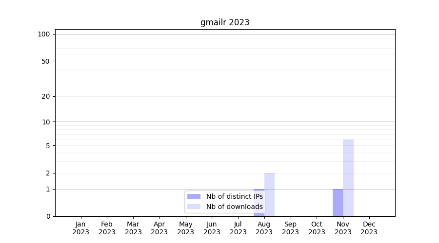 Number of downloads for workflow package gmailr, year by year, from 2025 back to 2015 (years with no downloads are omitted):