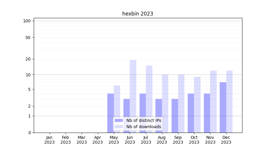 Number of downloads for workflow package hexbin, year by year, from 2025 back to 2015 (years with no downloads are omitted):