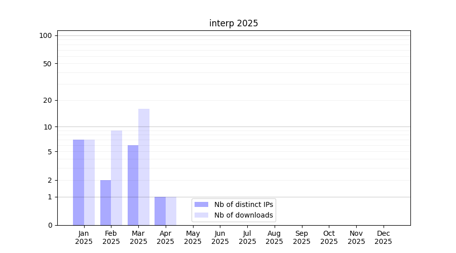 Number of downloads for workflow package interp, year by year, from 2025 back to 2015 (years with no downloads are omitted):