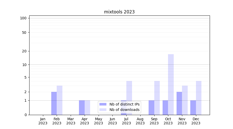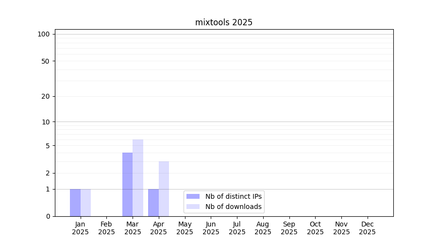 Number of downloads for workflow package mixtools, year by year, from 2025 back to 2015 (years with no downloads are omitted):