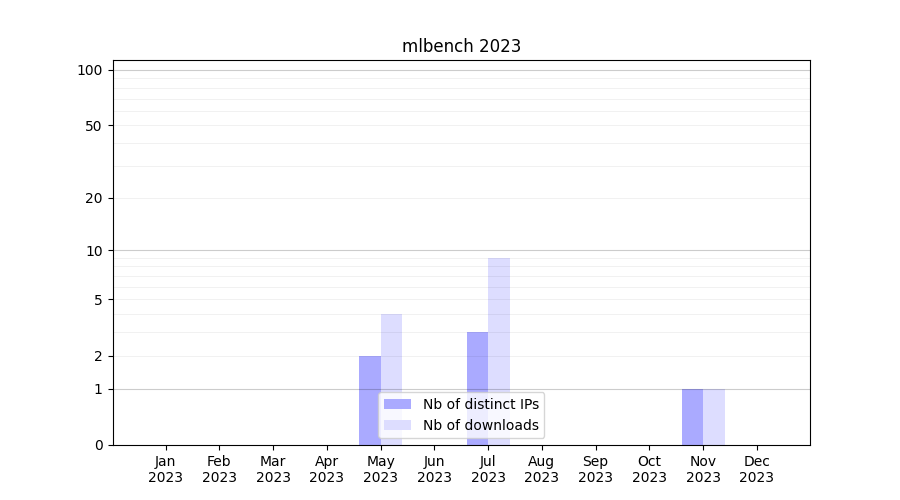 Number of downloads for workflow package mlbench, year by year, from 2025 back to 2015 (years with no downloads are omitted):