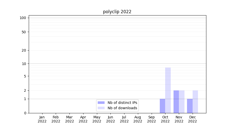 Number of downloads for workflow package polyclip, year by year, from 2025 back to 2015 (years with no downloads are omitted):