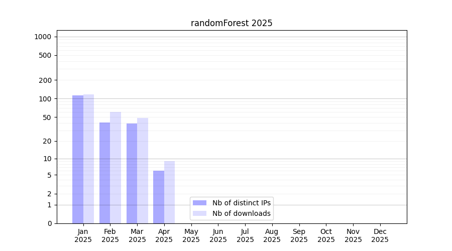 Number of downloads for workflow package randomForest, year by year, from 2025 back to 2015 (years with no downloads are omitted):