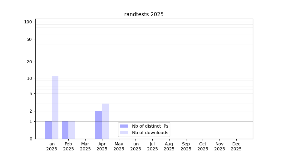 Number of downloads for workflow package randtests, year by year, from 2025 back to 2015 (years with no downloads are omitted):
