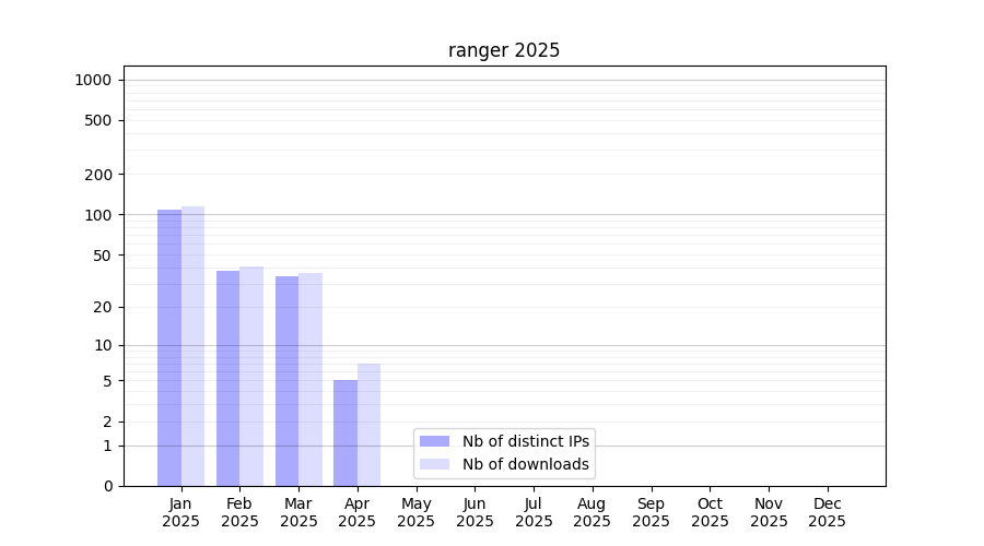 Number of downloads for workflow package ranger, year by year, from 2025 back to 2015 (years with no downloads are omitted):