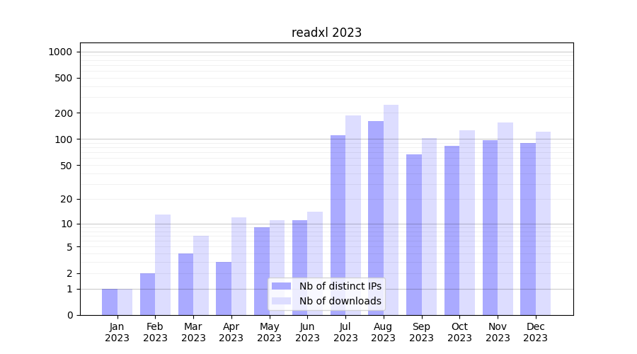 Number of downloads for workflow package readxl, year by year, from 2025 back to 2015 (years with no downloads are omitted):