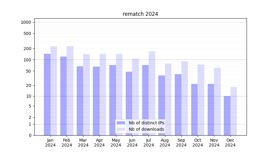 Number of downloads for workflow package rematch, year by year, from 2025 back to 2015 (years with no downloads are omitted):