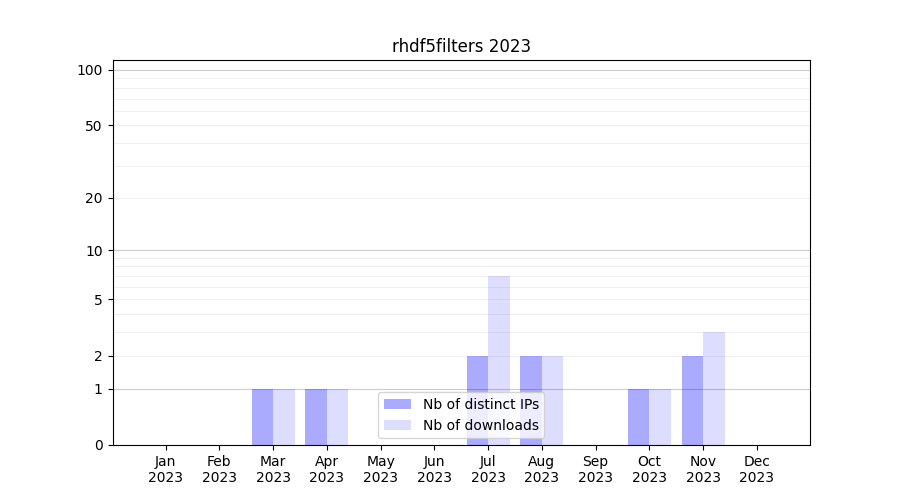 Number of downloads for workflow package rhdf5filters, year by year, from 2025 back to 2015 (years with no downloads are omitted):