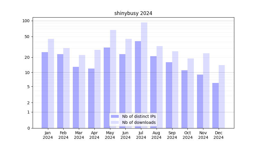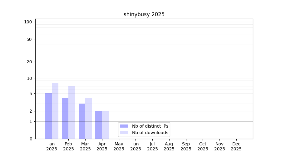 Number of downloads for workflow package shinybusy, year by year, from 2025 back to 2015 (years with no downloads are omitted):