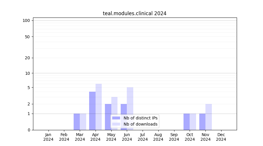 Number of downloads for workflow package teal.modules.clinical, year by year, from 2025 back to 2015 (years with no downloads are omitted):