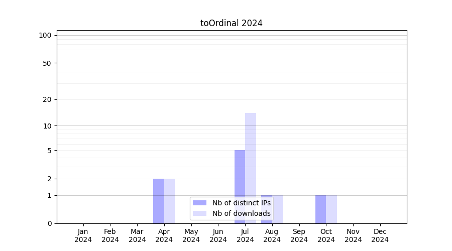 Number of downloads for workflow package toOrdinal, year by year, from 2025 back to 2015 (years with no downloads are omitted):