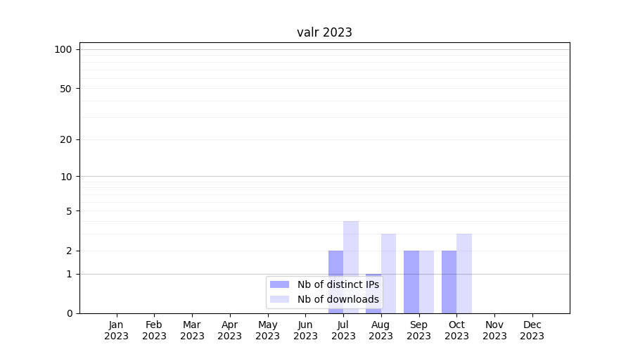 Number of downloads for workflow package valr, year by year, from 2025 back to 2015 (years with no downloads are omitted):