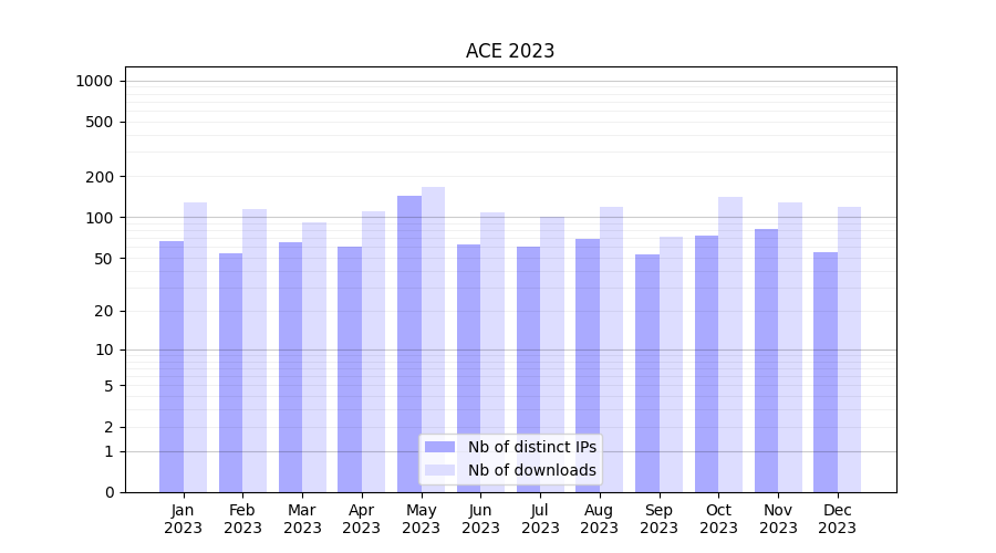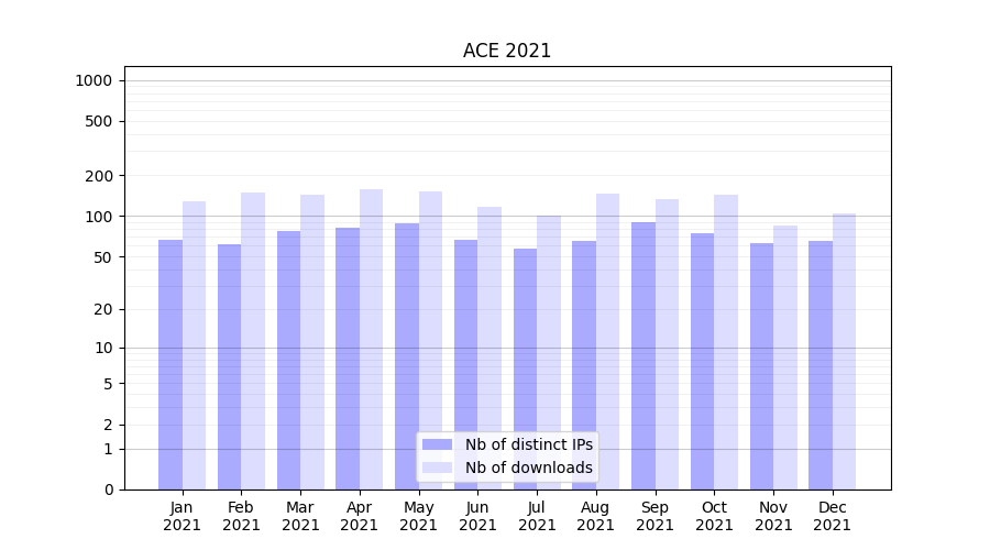 Number of downloads for software package ACE, year by year, from 2025 back to 2014 (years with no downloads are omitted):
