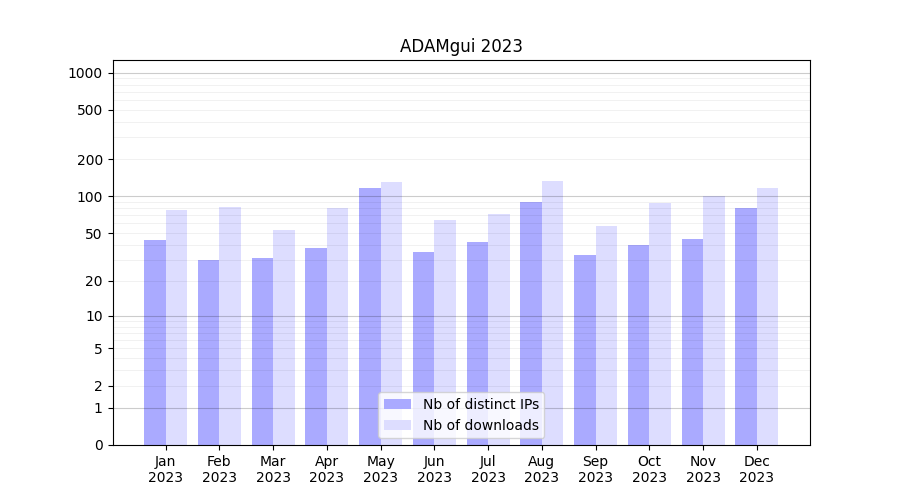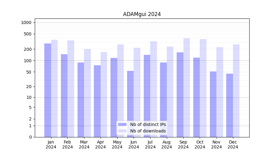 Number of downloads for software package ADAMgui, year by year, from 2025 back to 2014 (years with no downloads are omitted):