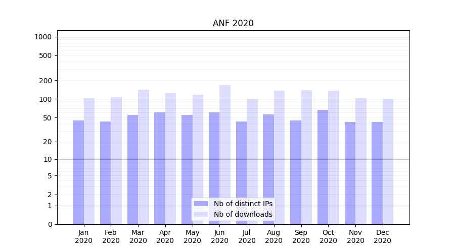 Number of downloads for software package ANF, year by year, from 2025 back to 2014 (years with no downloads are omitted):