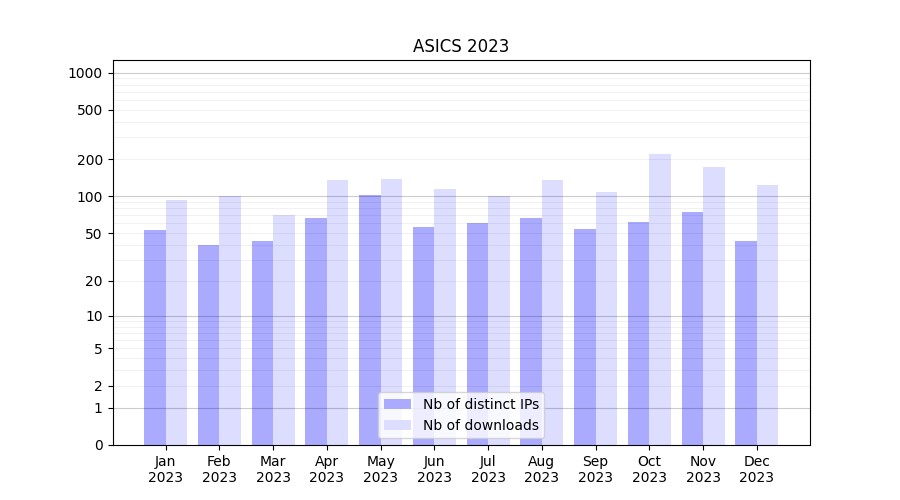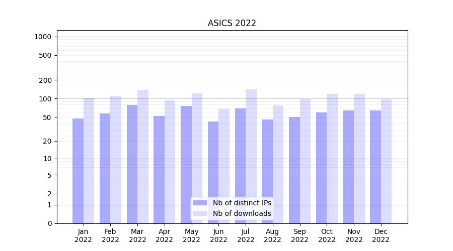 Number of downloads for software package ASICS, year by year, from 2025 back to 2014 (years with no downloads are omitted):