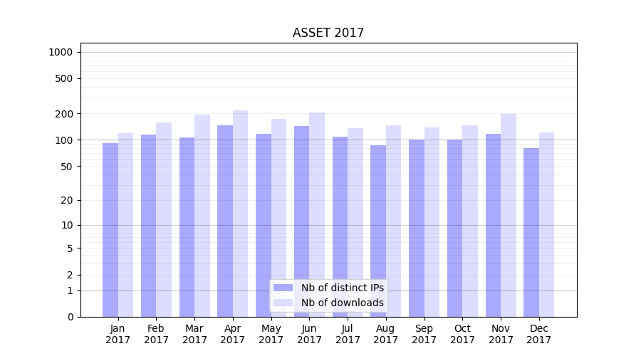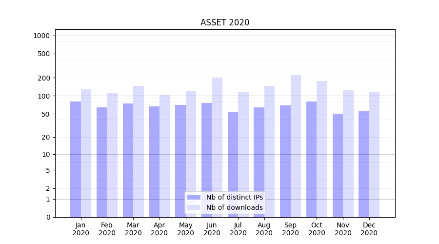 Number of downloads for software package ASSET, year by year, from 2025 back to 2014 (years with no downloads are omitted):