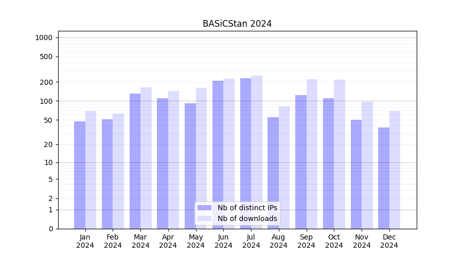 Number of downloads for software package BASiCStan, year by year, from 2025 back to 2014 (years with no downloads are omitted):