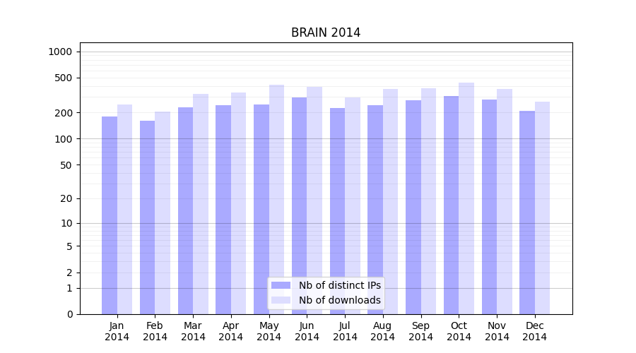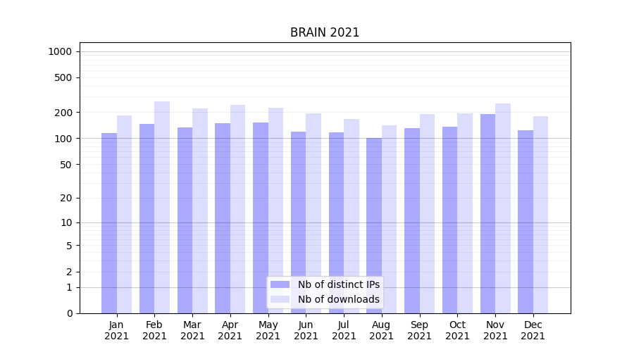 Number of downloads for software package BRAIN, year by year, from 2025 back to 2014 (years with no downloads are omitted):