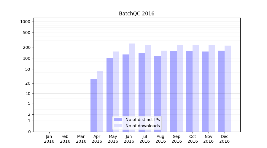 Number of downloads for software package BatchQC, year by year, from 2025 back to 2014 (years with no downloads are omitted):