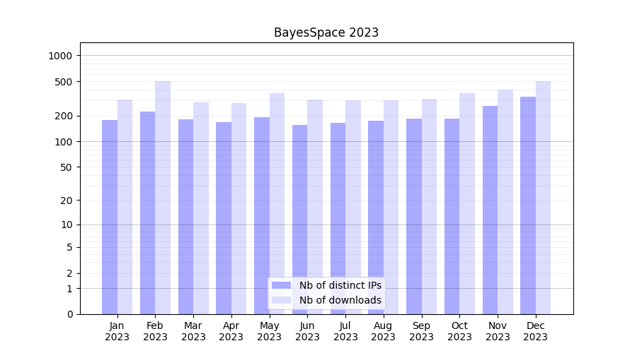 Number of downloads for software package BayesSpace, year by year, from 2025 back to 2014 (years with no downloads are omitted):