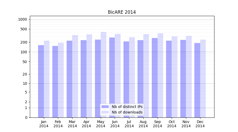 Number of downloads for software package BicARE, year by year, from 2025 back to 2014 (years with no downloads are omitted):