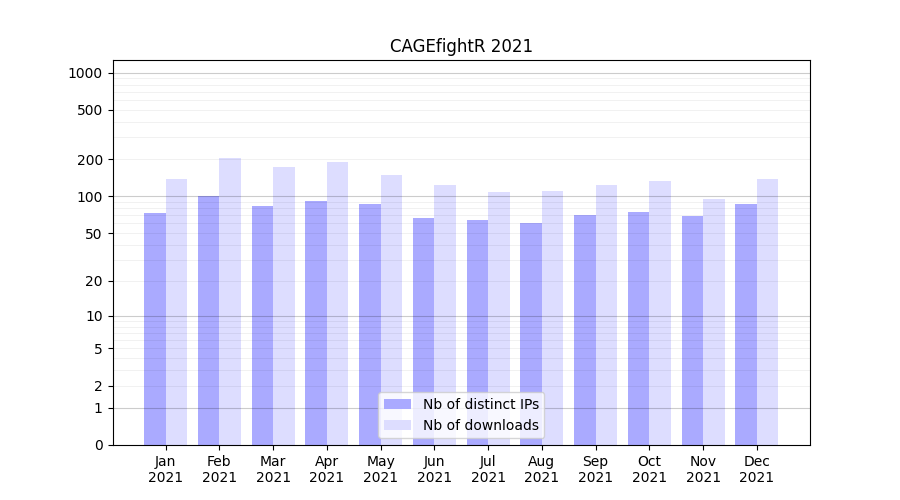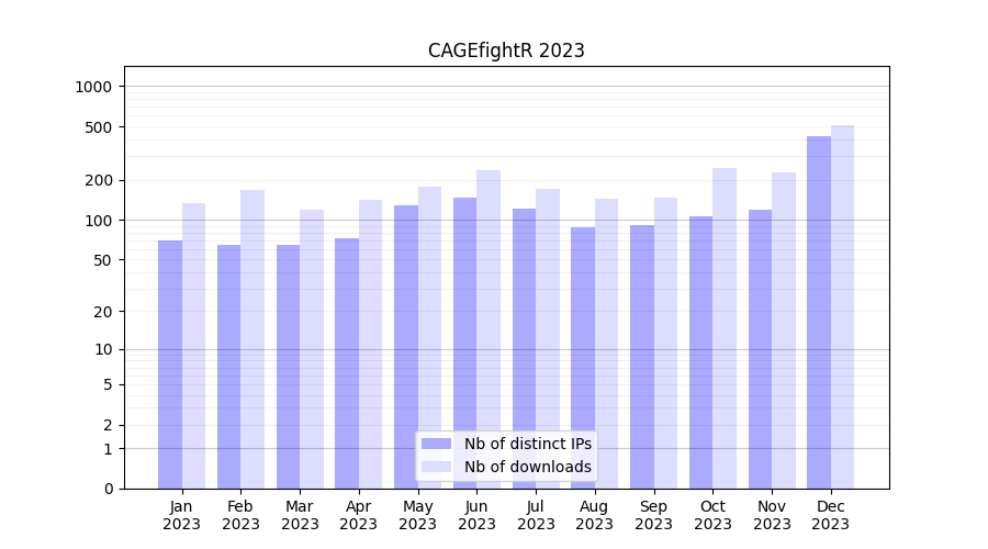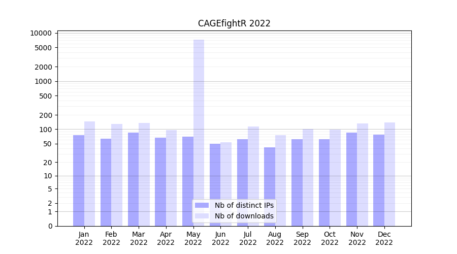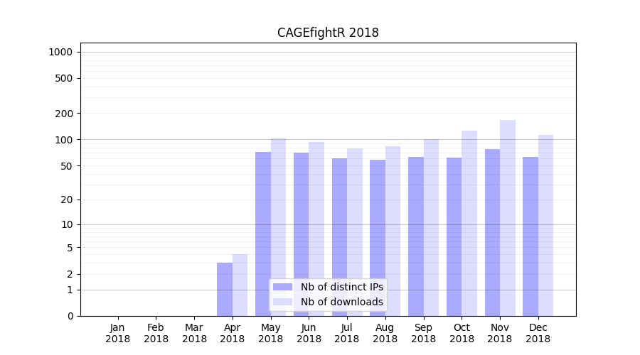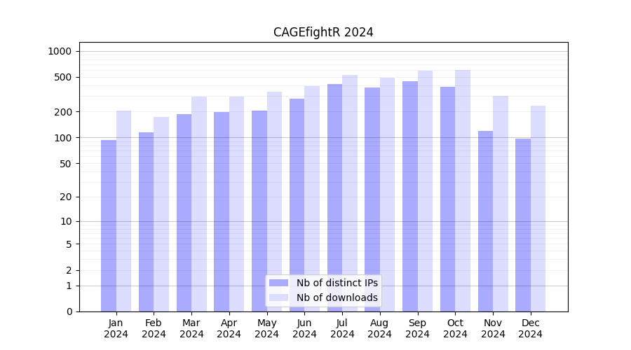 Number of downloads for software package CAGEfightR, year by year, from 2025 back to 2014 (years with no downloads are omitted):