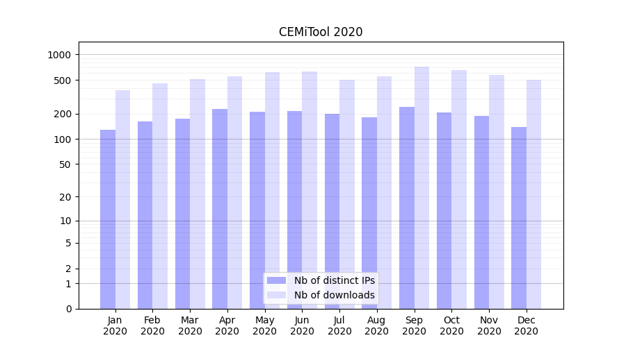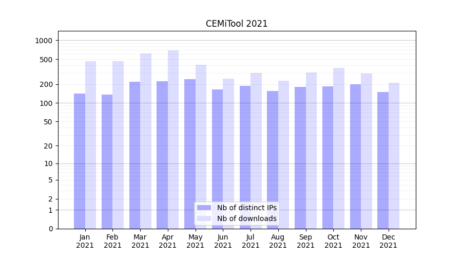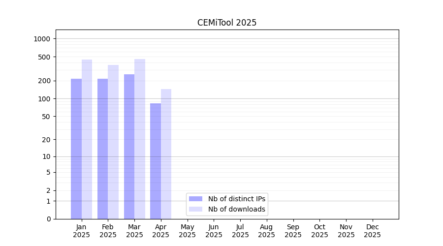 Number of downloads for software package CEMiTool, year by year, from 2025 back to 2014 (years with no downloads are omitted):