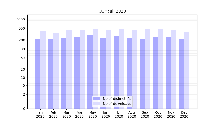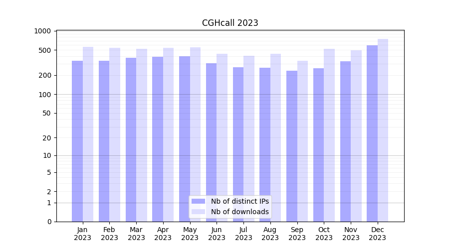 Number of downloads for software package CGHcall, year by year, from 2025 back to 2014 (years with no downloads are omitted):