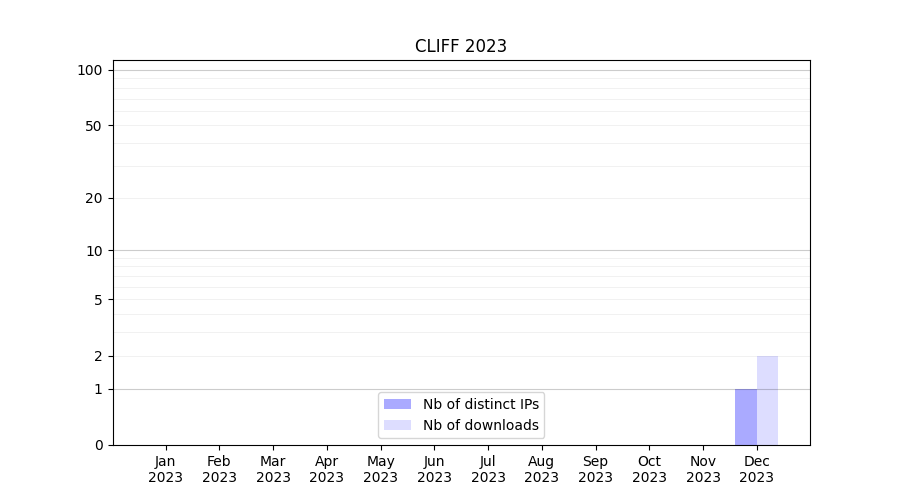 Number of downloads for software package CLIFF, year by year, from 2025 back to 2014 (years with no downloads are omitted):