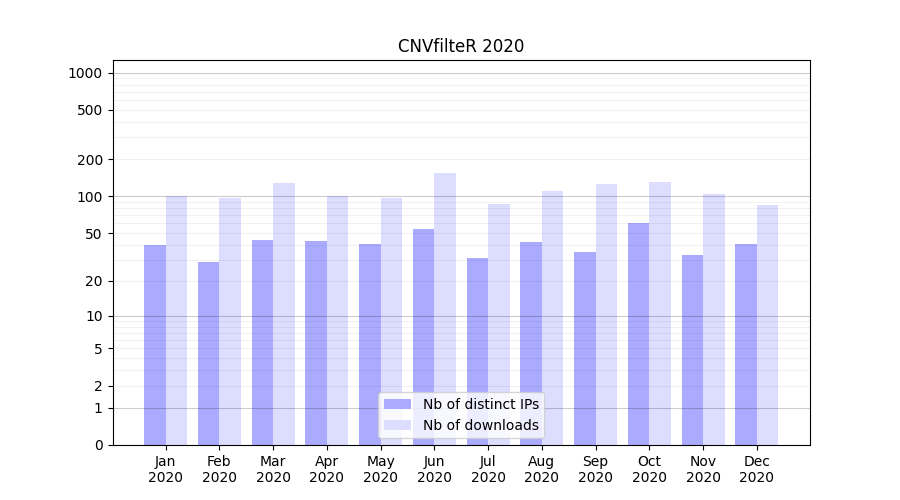 Number of downloads for software package CNVfilteR, year by year, from 2025 back to 2014 (years with no downloads are omitted):