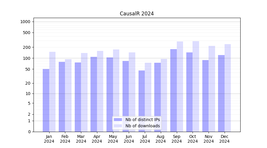 Number of downloads for software package CausalR, year by year, from 2025 back to 2014 (years with no downloads are omitted):