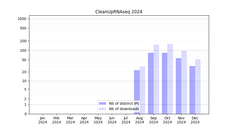 Number of downloads for software package CleanUpRNAseq, year by year, from 2025 back to 2014 (years with no downloads are omitted):
