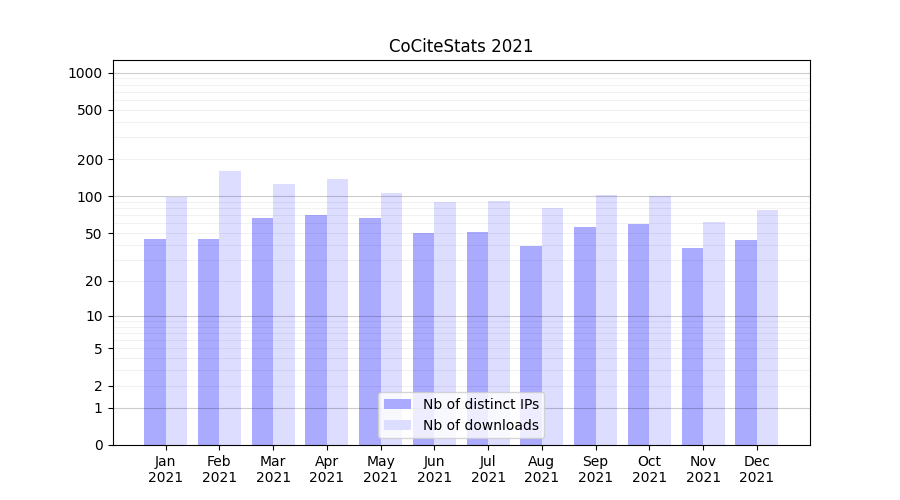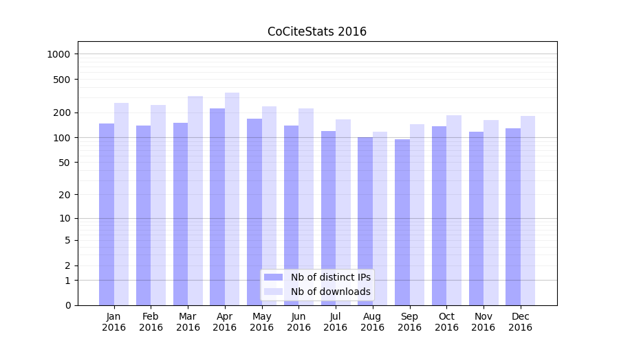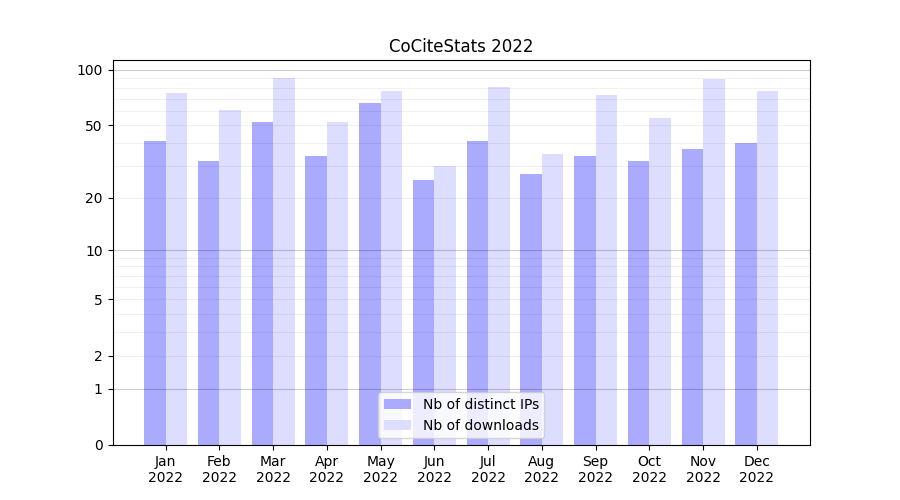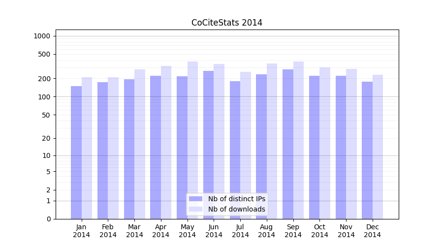 Number of downloads for software package CoCiteStats, year by year, from 2025 back to 2014 (years with no downloads are omitted):