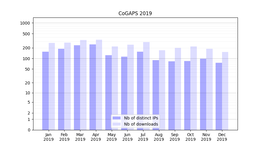 Number of downloads for software package CoGAPS, year by year, from 2025 back to 2014 (years with no downloads are omitted):