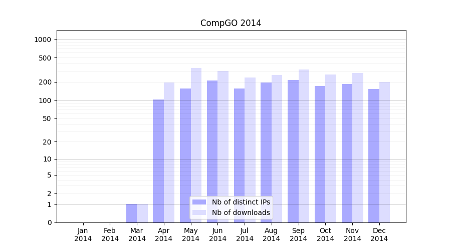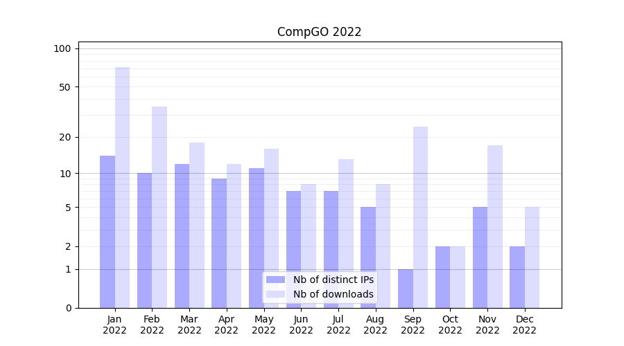 Number of downloads for software package CompGO, year by year, from 2025 back to 2014 (years with no downloads are omitted):