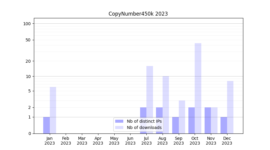 Number of downloads for software package CopyNumber450k, year by year, from 2025 back to 2014 (years with no downloads are omitted):