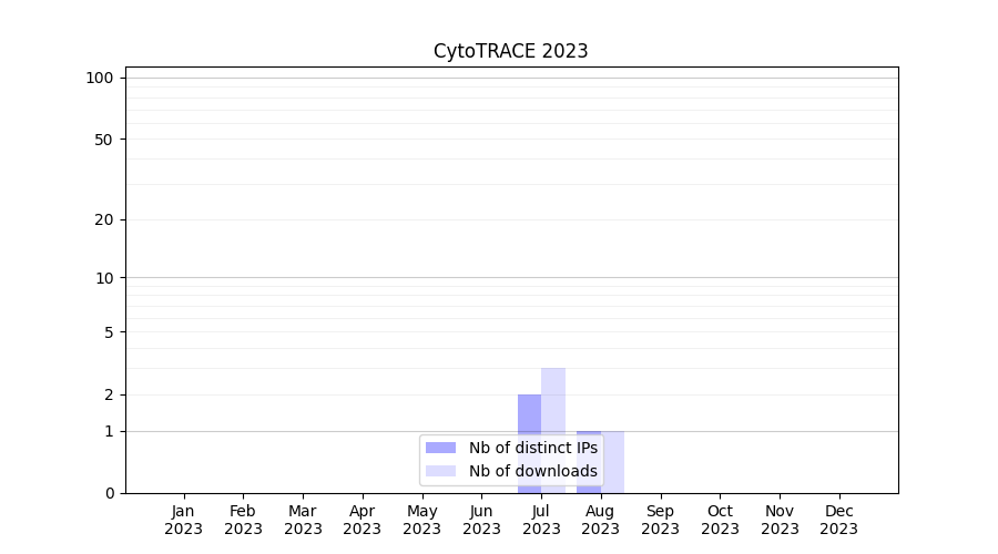 Number of downloads for software package CytoTRACE, year by year, from 2025 back to 2014 (years with no downloads are omitted):