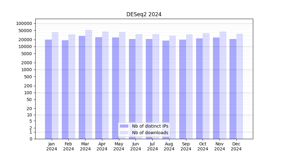 Number of downloads for software package DESeq2, year by year, from 2025 back to 2014 (years with no downloads are omitted):