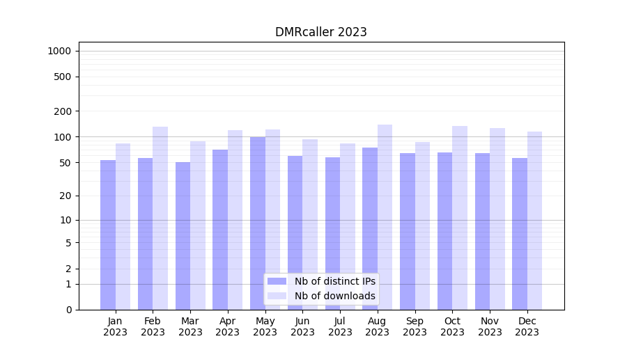 Number of downloads for software package DMRcaller, year by year, from 2025 back to 2014 (years with no downloads are omitted):
