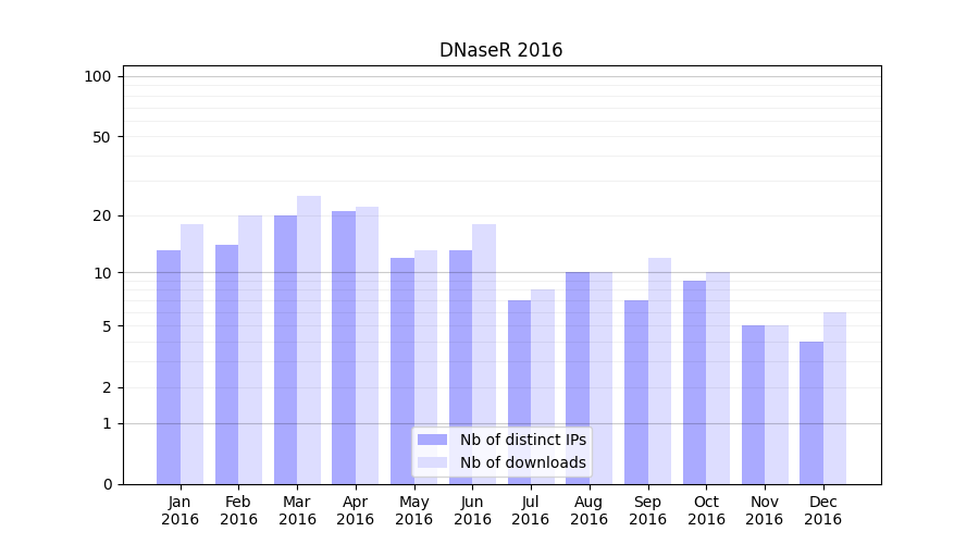 Number of downloads for software package DNaseR, year by year, from 2025 back to 2014 (years with no downloads are omitted):