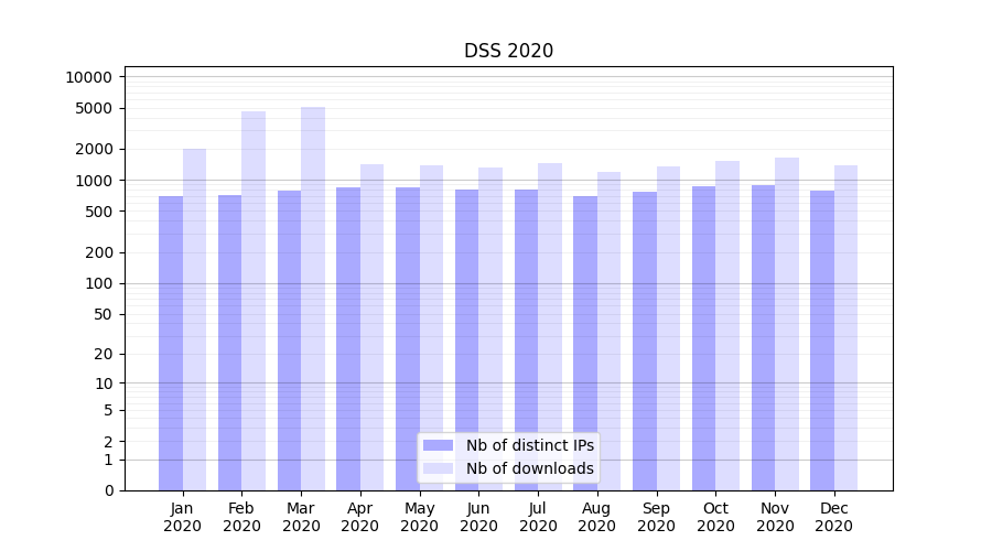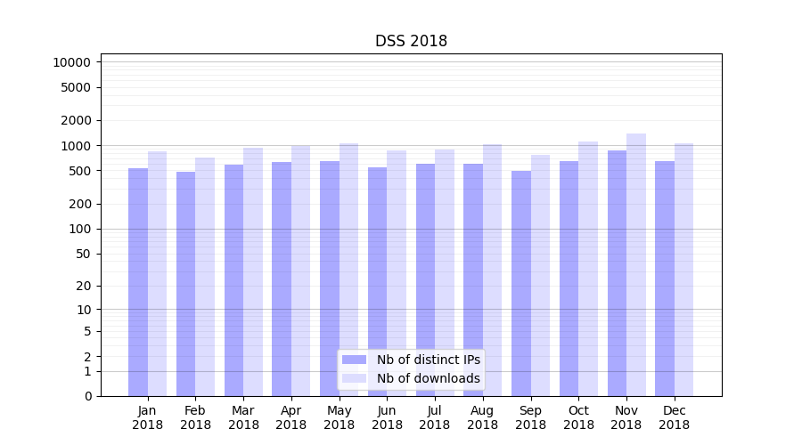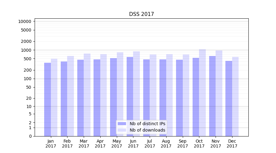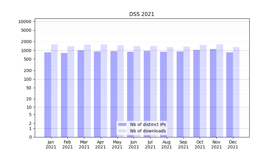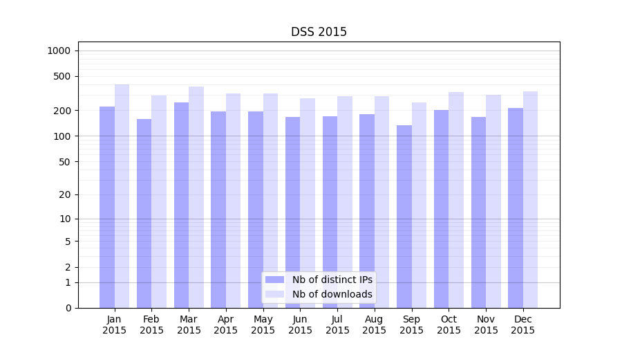 Number of downloads for software package DSS, year by year, from 2025 back to 2014 (years with no downloads are omitted):