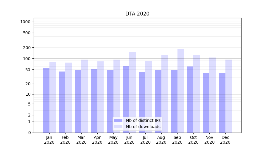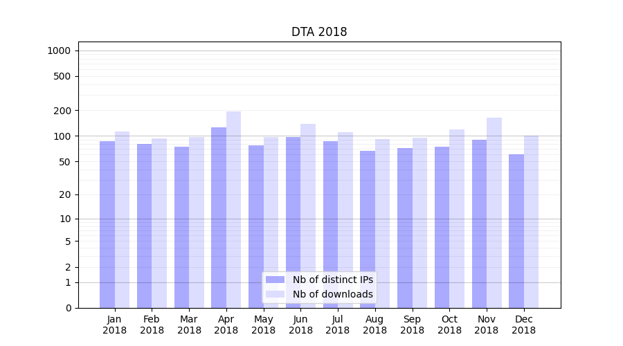 Number of downloads for software package DTA, year by year, from 2025 back to 2014 (years with no downloads are omitted):